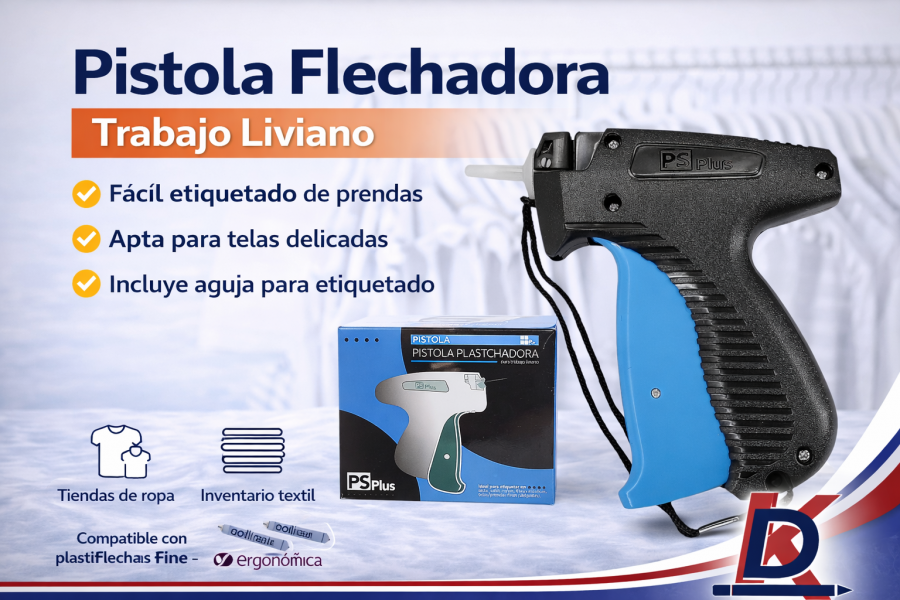 La pistola flechadora plastiflecha trabajo liviano PS Plus es una herramienta esencial para el etiquetado profesional de prendas en tiendas, almacenes y empresas del sector textil. Diseñada para ofrecer precisión, comodidad y eficiencia, permite fijar etiquetas de manera rápida sin dañar telas delicadas.