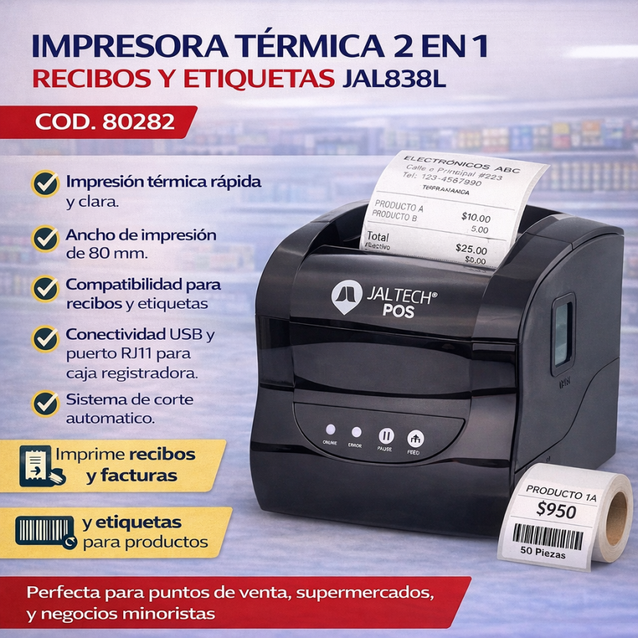Optimiza tu punto de venta con la impresora térmica Jaltech JAL838L, una solución versátil diseñada para imprimir tanto recibos como etiquetas en un solo equipo. Es la opción ideal para negocios que buscan rapidez, confiabilidad y ahorro de espacio, integrando múltiples funciones en una sola impresora profesional.