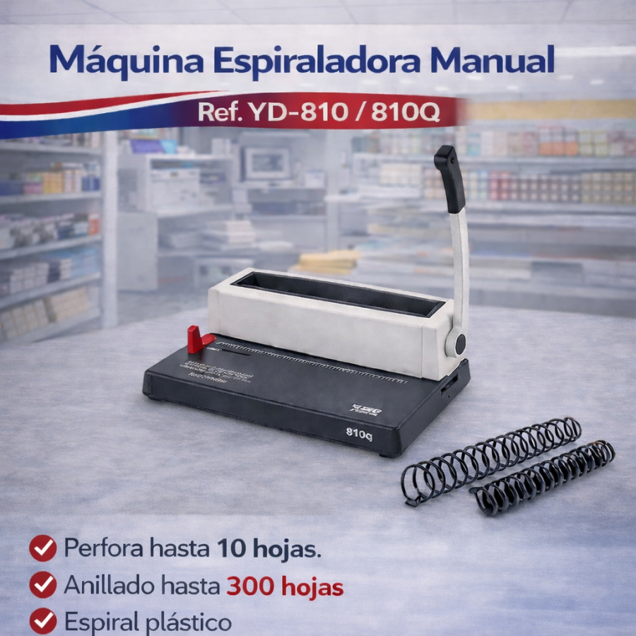 Máquina espiraladora manual ideal para papelerías y centros de copiado. Perfora hasta 10 hojas y permite anillar documentos de hasta 300 hojas con espiral plástico.