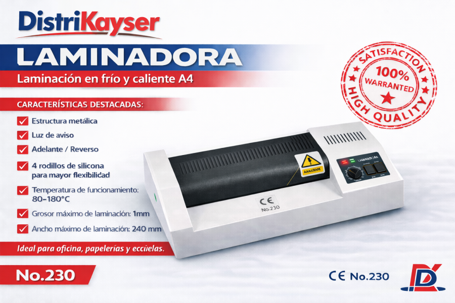 Laminadora A4 en frío y caliente con estructura metálica, 4 rodillos de silicona y control de temperatura. Ideal para oficina, papelerías y uso escolar.