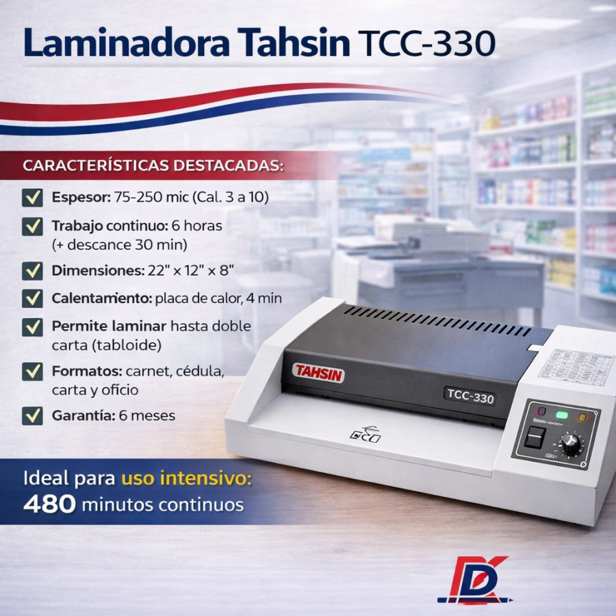 La laminadora Tahsin TCC-330 es una máquina profesional diseñada para uso intensivo en papelerías, centros de copiado, oficinas y negocios gráficos. Soporta trabajo continuo de hasta 6 horas (480 minutos), ofreciendo un desempeño estable y confiable.